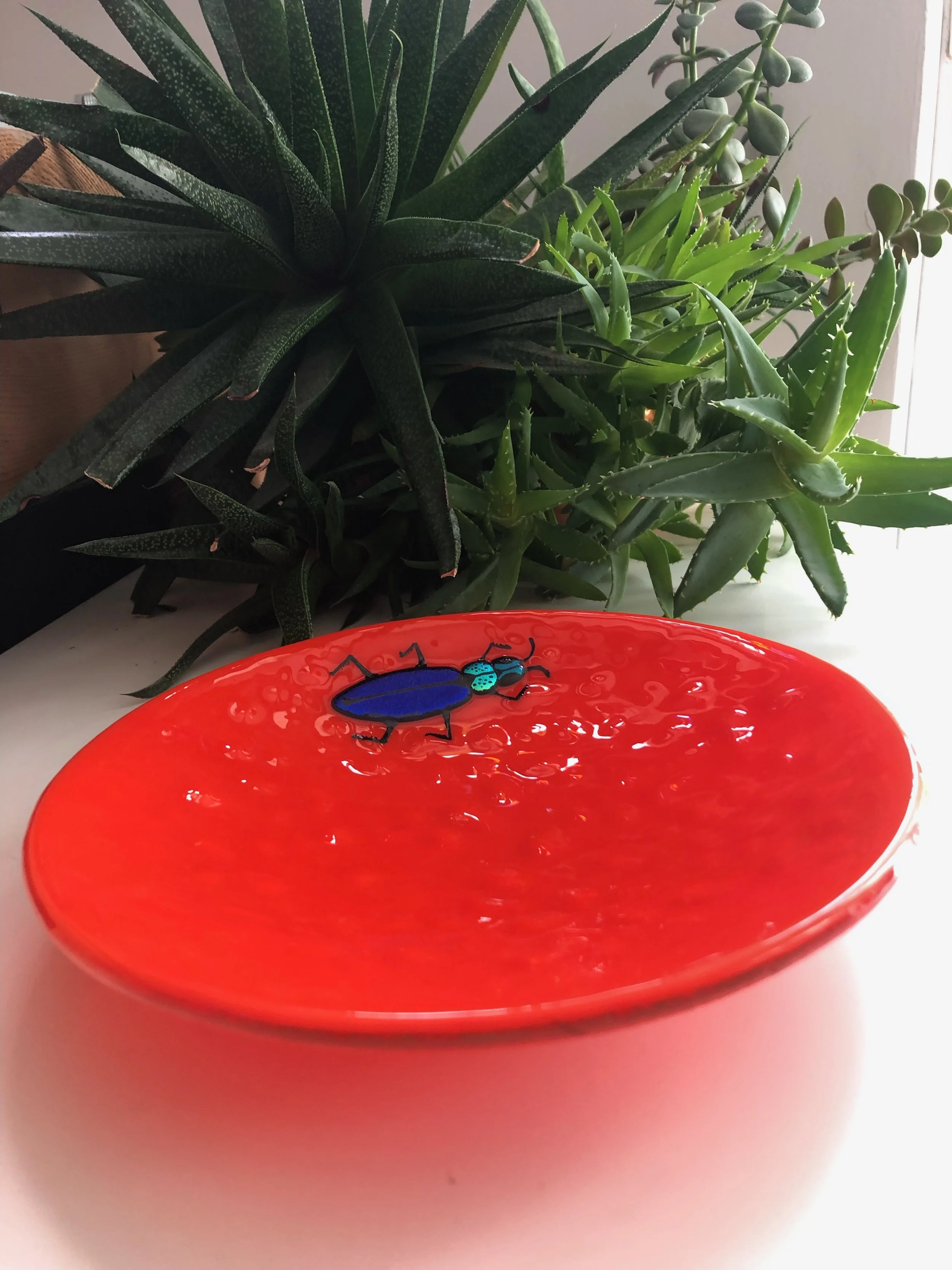 Orange bowl with a little dichroic beetle fused onto it. The bowl has little air bubbles trapped in-between the two layers of glass giving this lovely texture and tactile surface.