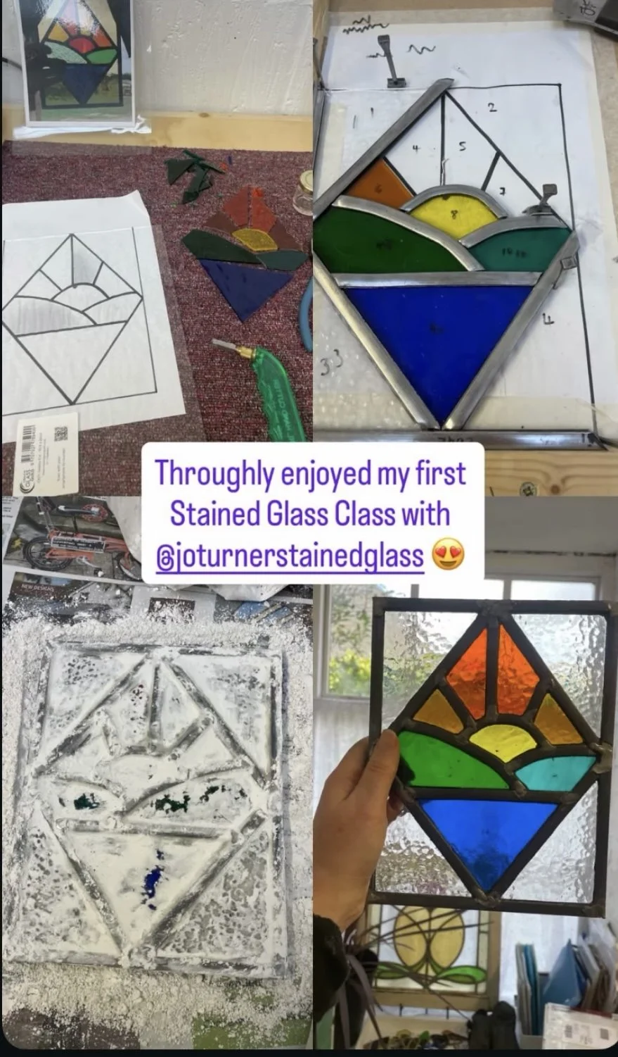 "Absolutely fab. Exactly what I was looking for in terms of a fully comprehensive craft course. History, theory & practical of stained glass was all covered throughly during the 2 days. Jo was a welcoming and patient tutor who clearly enjoyed the craft herself, and that showed in her enthusiasm with all of us. Would very much recommend Jo's work and sessions to all. Thanks so much and I hope to work with you again in the future. " - Emily H